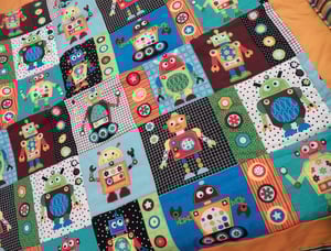 Any small boy will love this fun and vibrant robot quilt. The front, main piece is one large piece, that is quilted around certain robot squares to hold it together. The sides are seperate orange pieces. The back of the quilt is in one striped piece, and the sides wrap around as the edges on the front.